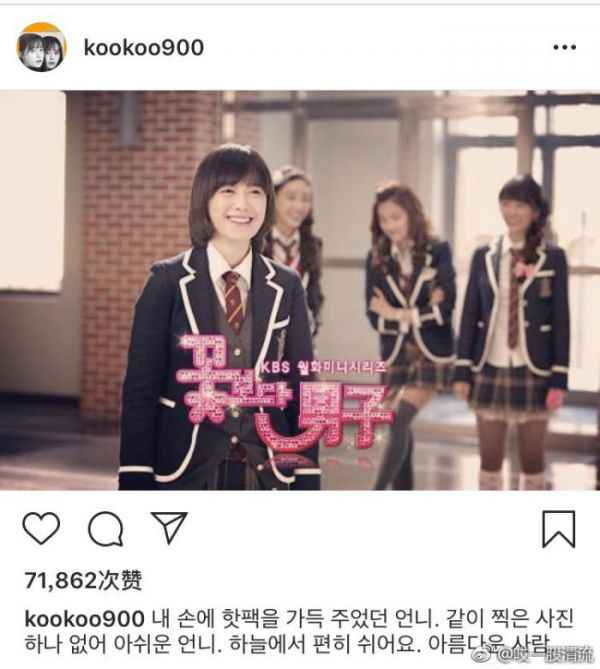 就在3月17日,饰演韩版流星花园的《花样男子》里金丝草一角的具惠善为已故张紫妍发声,并配文道:“塞暖宝宝在我手里的姐姐,很遗憾一张照片都没有一起拍过的姐姐,在天上好好休息吧,美丽的人。”