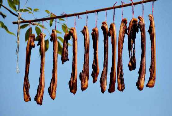 晒腊肉的天气也要控制好。温度宜保持在10℃左右,宜晴多风。这样腌制的肉在干燥15-20天左右后味道最好。